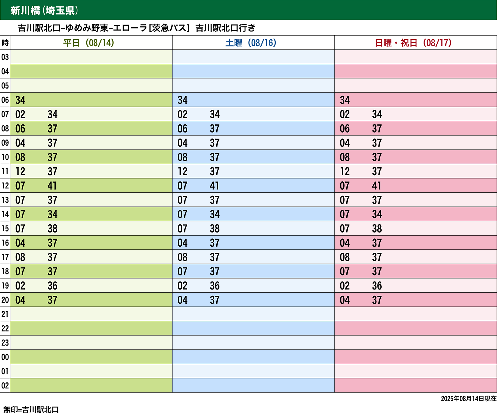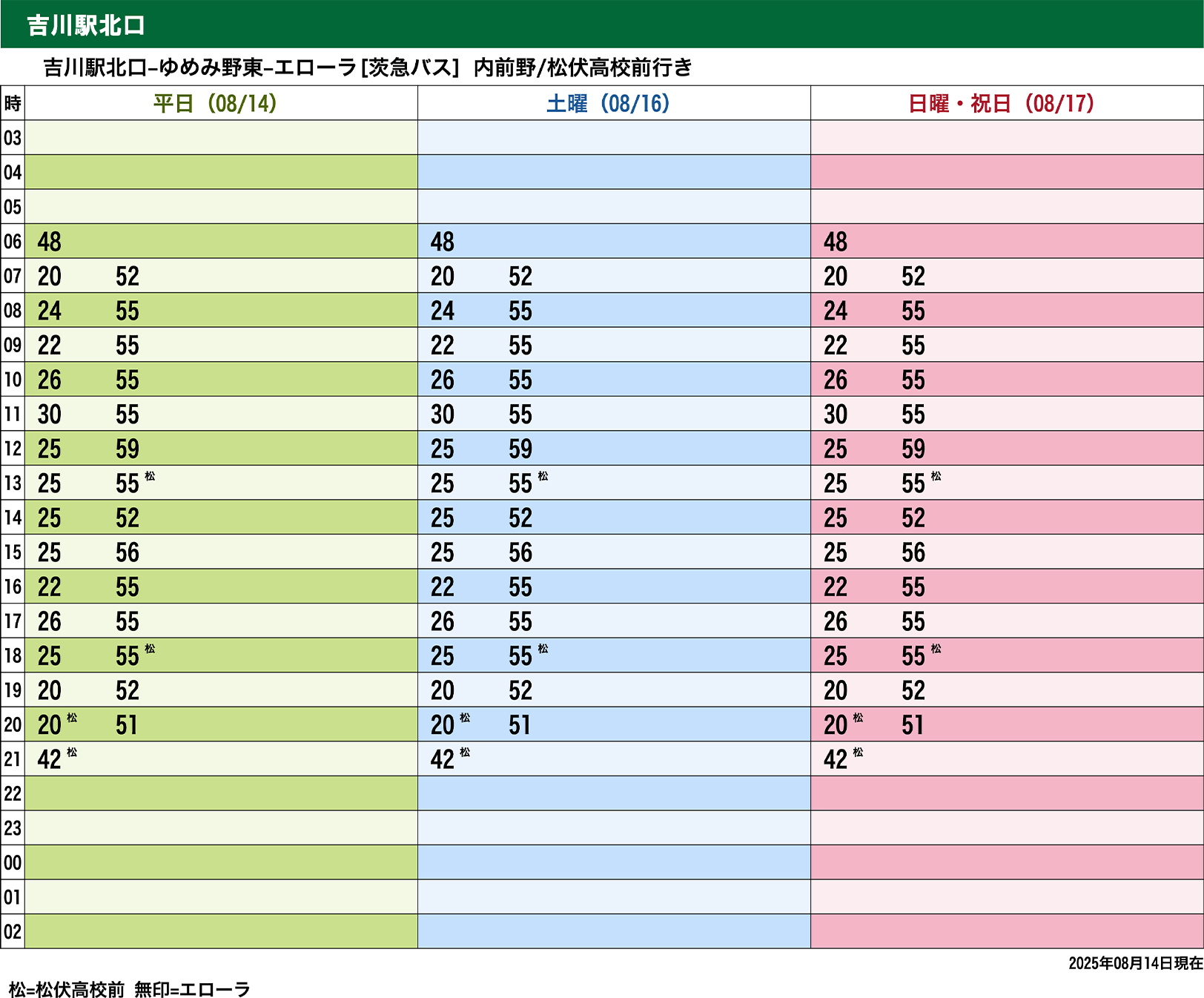 越谷工場発の赤時刻と緑時刻のダイヤは目安時刻です。